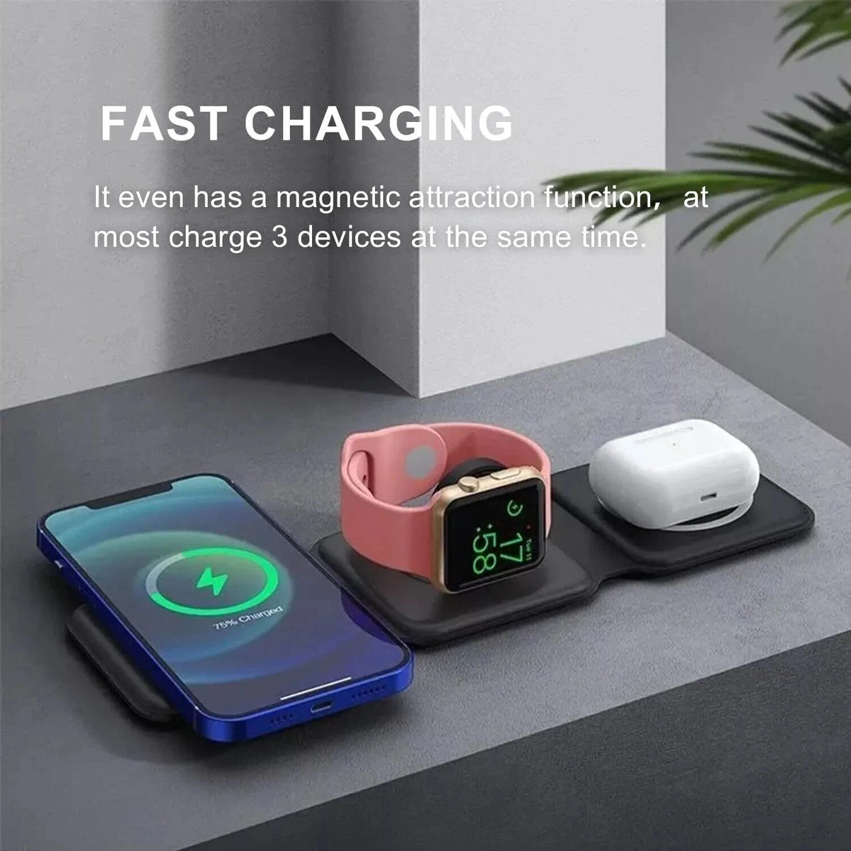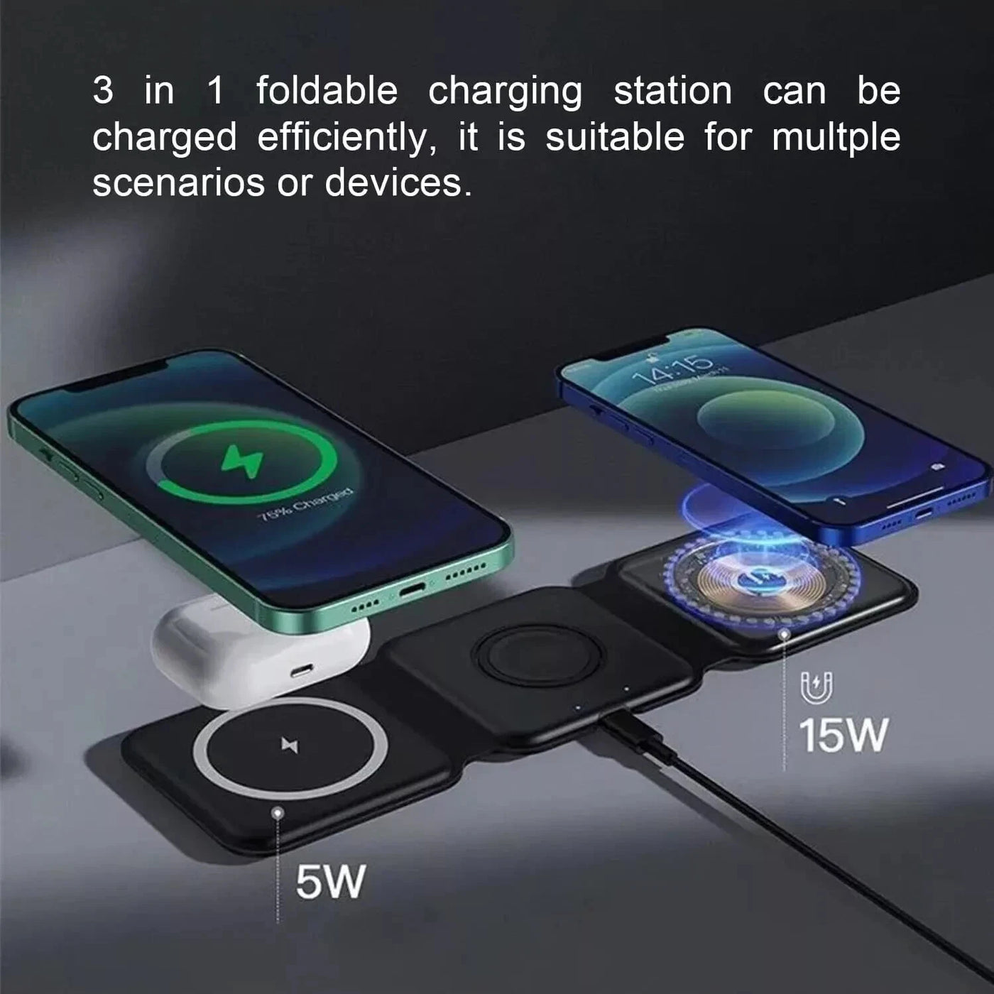 This 3-in-1 foldable wireless charging station is a practical and modern solution for charging your smartphone, smartwatch, and wireless earphones at the same time. Designed with magnetic alignment, it helps keep your devices perfectly positioned for stable and efficient charging.